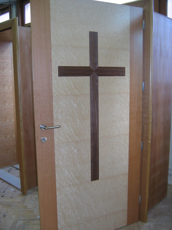 • Vrata, kjer je križ, so narejene z intarzijo križa, ki je vložen v furnir ptičji javor