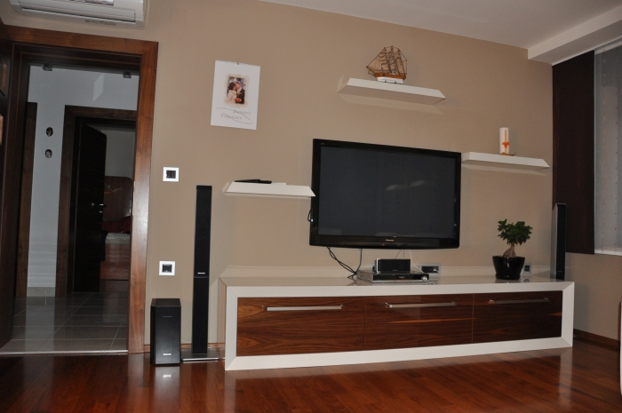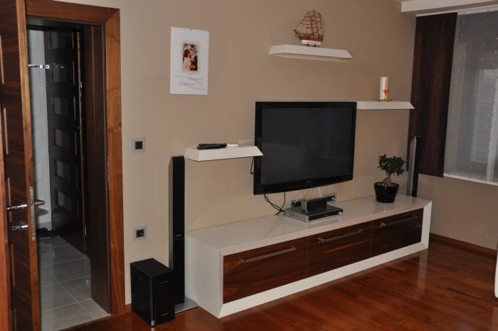 • 100% sijaj: bel MDF (=mediapan) in furnir ameriški oreh