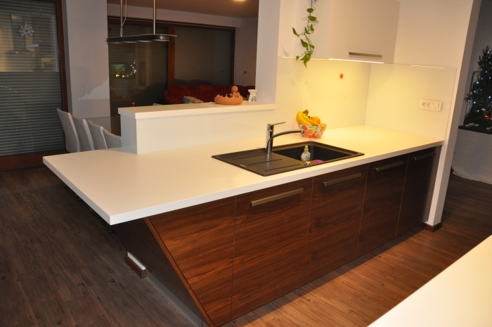 - Svetli del kuhinje in pulti: bel ultrapas, ki ima tudi belo sredico – daje izgled monolitnega kosa
