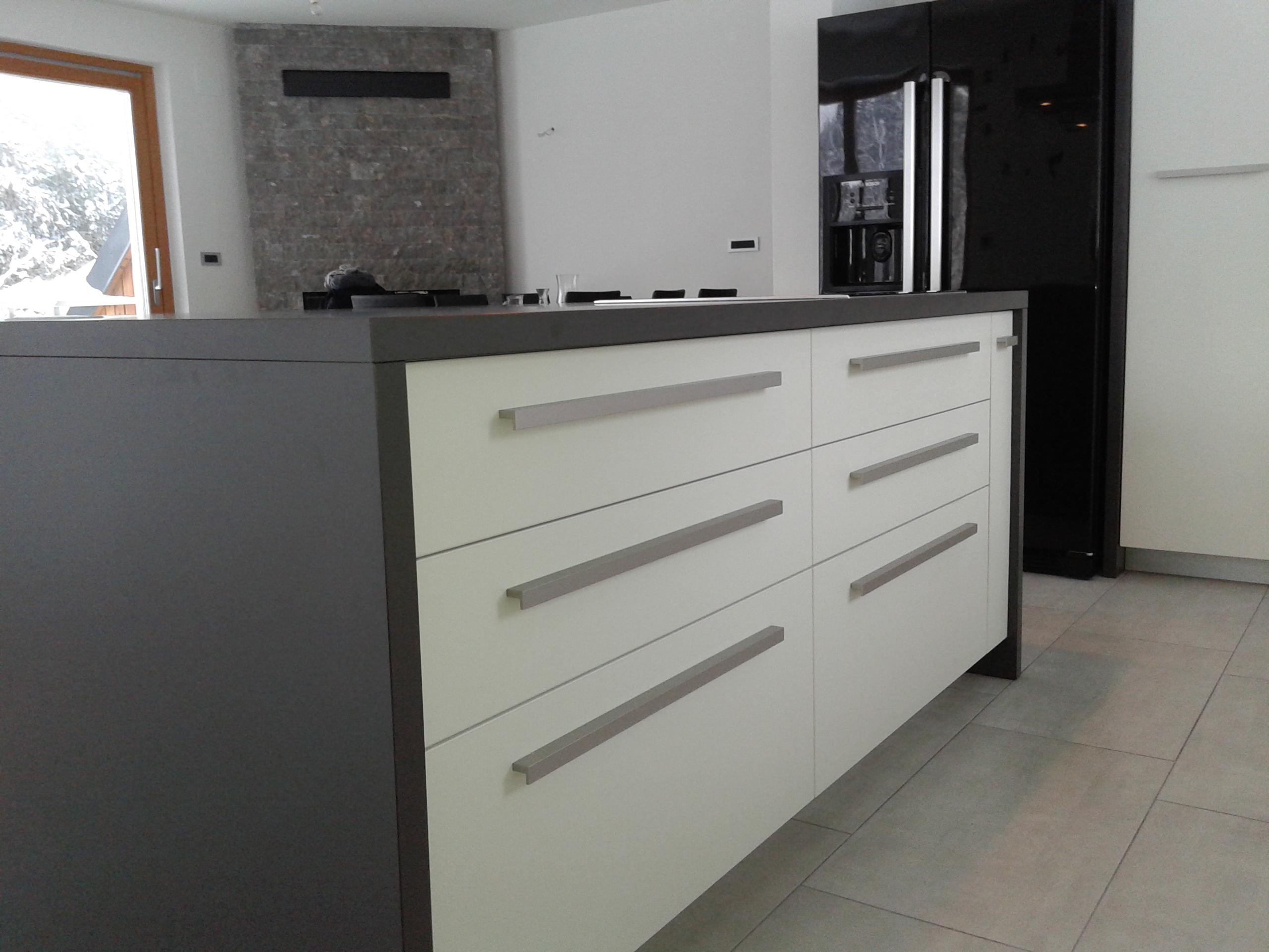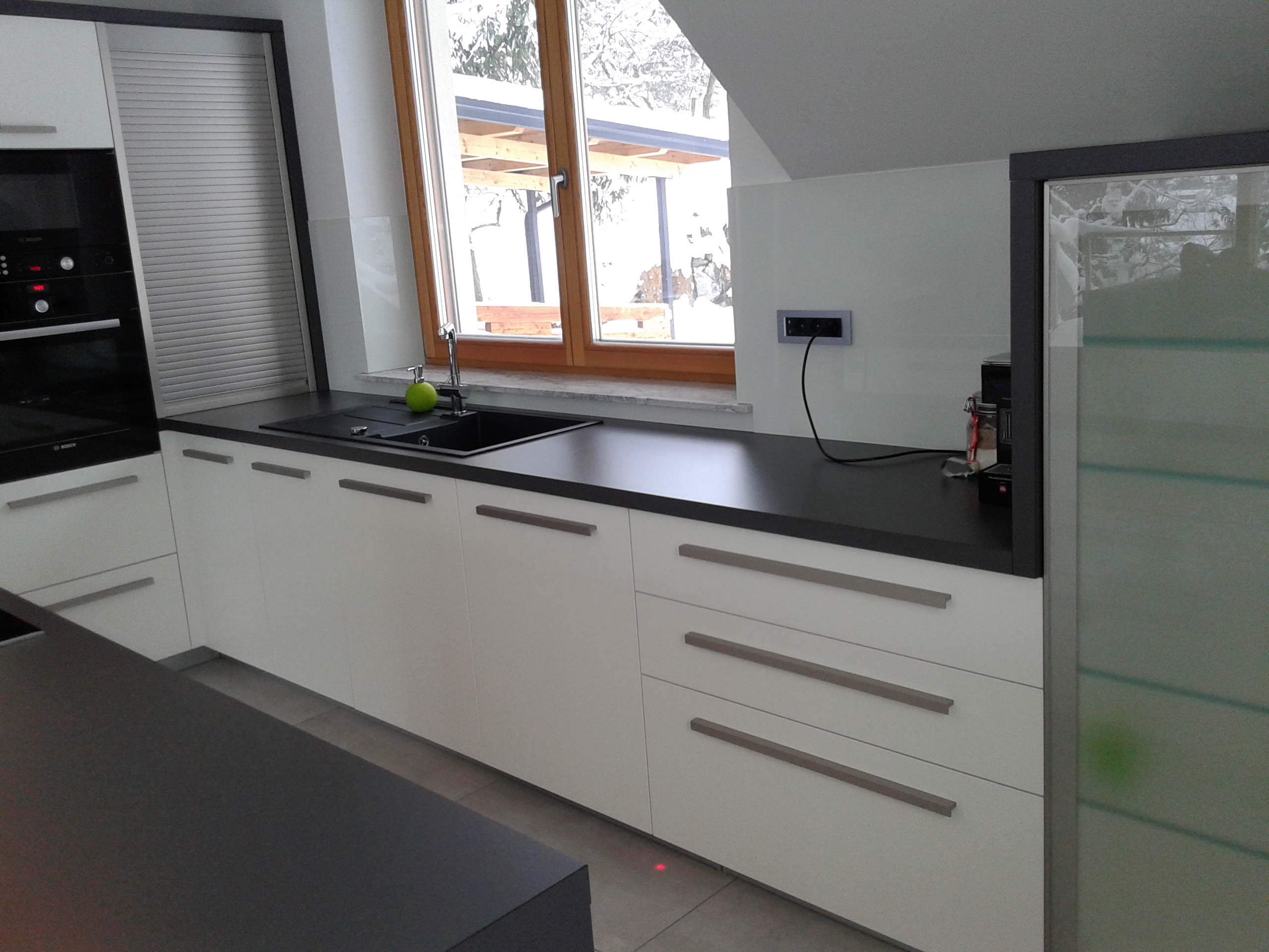 - Sivi del kuhinje je iz grafitno sivega ultrapasa (Fundermax) v kombinaciji z belim iveralom z ABS nalimki