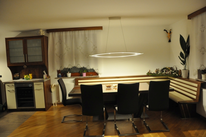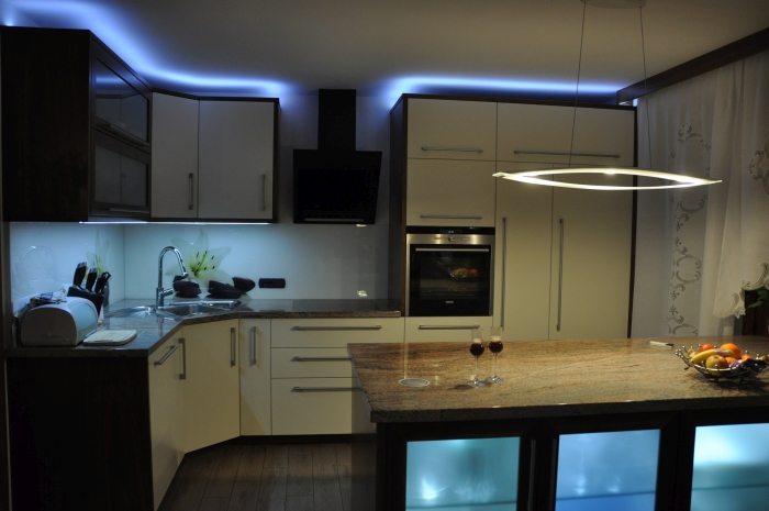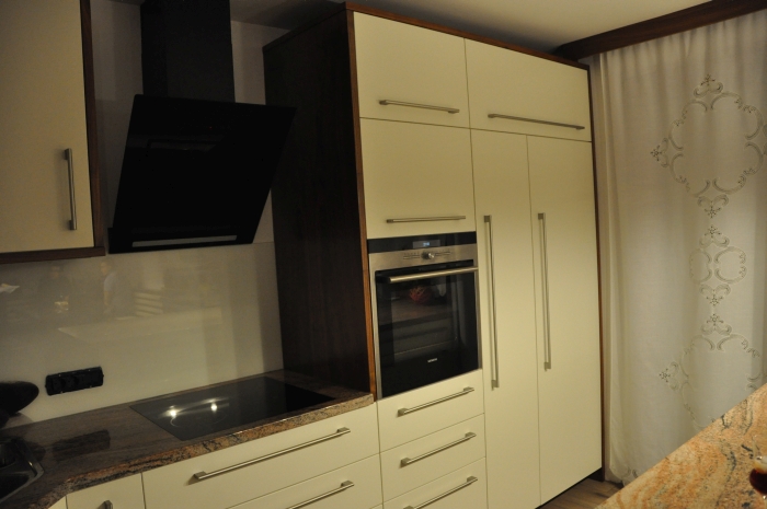 - Kuhinja je narejena iz belega barvanega MDF-a v kombinaciji z ameriškim orehom