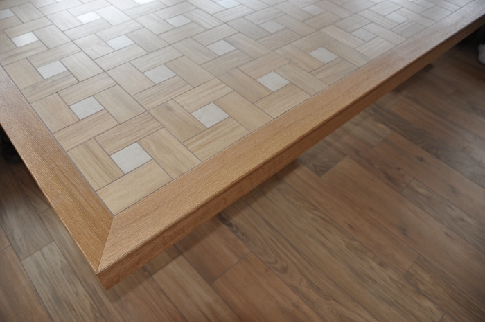 - Jedilna miza in klop sta narejeni iz hrastovega furnirja v kombinaciji z masivo – krtačeno in lakirano z mat lakom