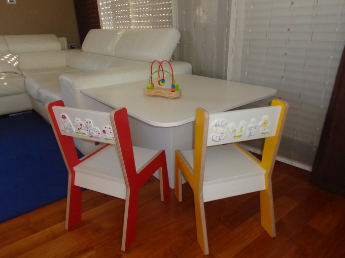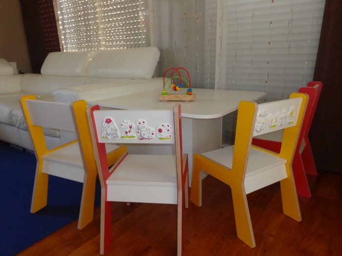 - V sodelovanju s Fletno štacunco so na stolih prilepljene ročno izdelane črke z napisom imen in so narejene po željah naročnika, ki sovpadajo z nalepkami v otroški sobi