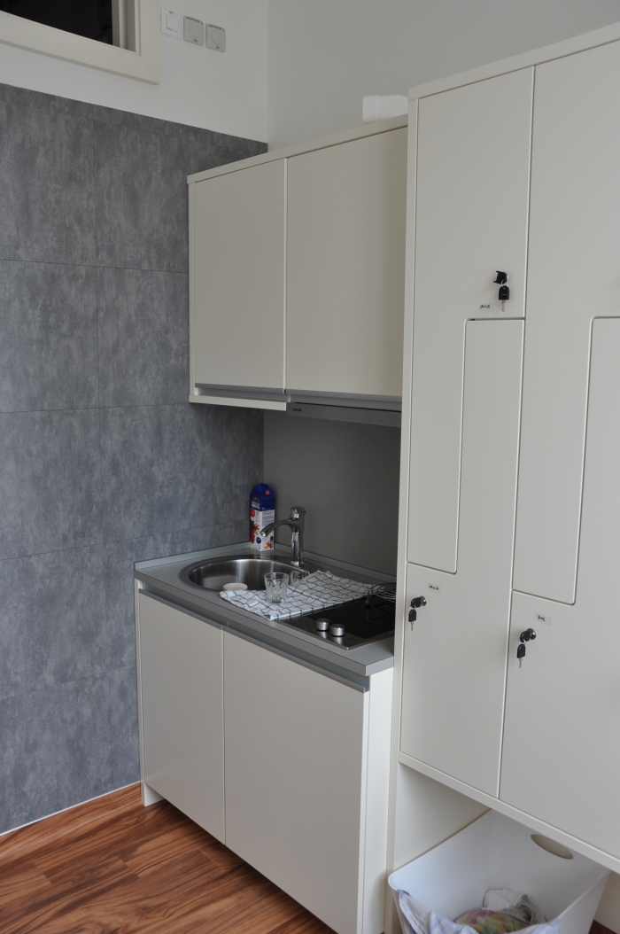 - Čajna kuhinja in garderobne omarice so iz belo barvanega MDF-a